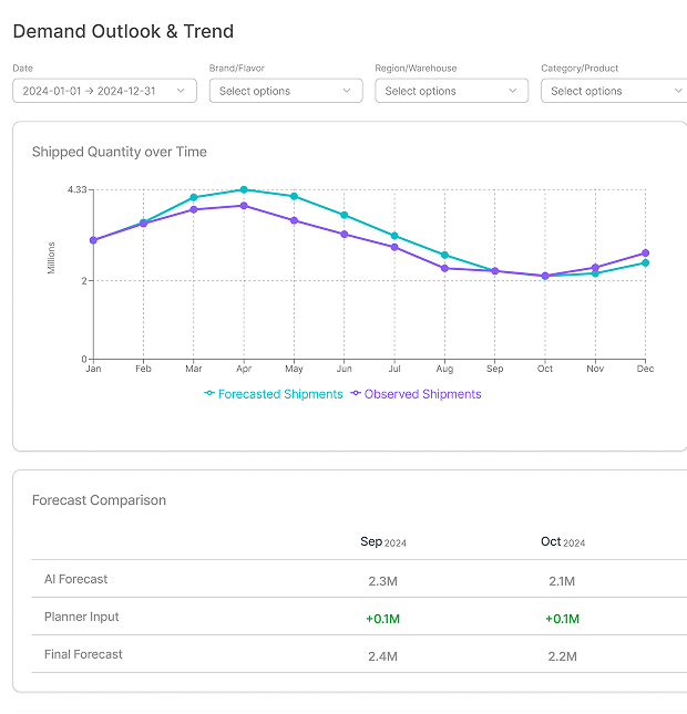 | Demand Forecast AI | Baseline forecast generation at SKU-location scaleDriver-level explainability for every predictionConfidence scoring with “no-touch” recommendations |